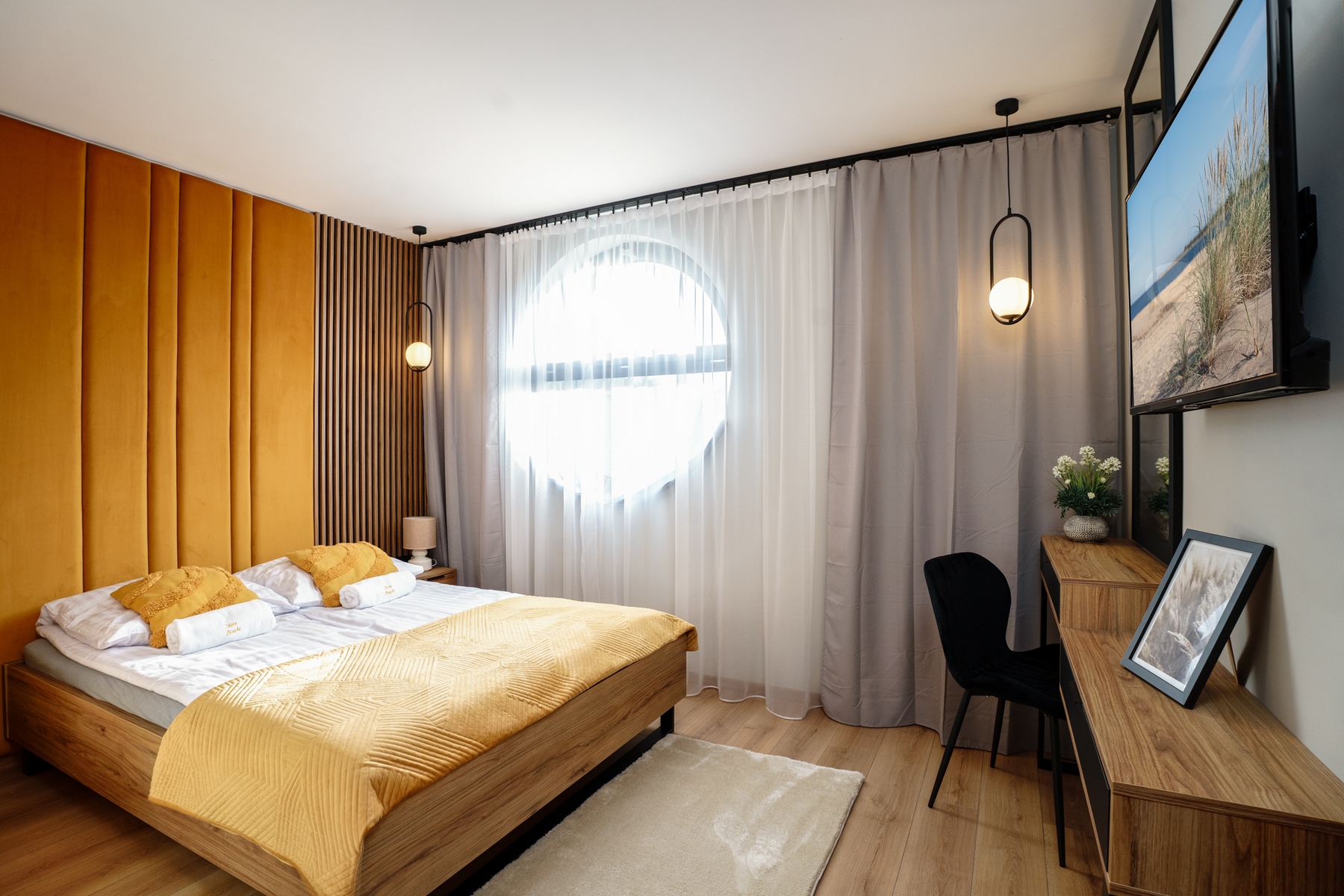 Dwuosobowe łóżko małżeńskie w sypialni + rozkładany dwuosobowy narożnik z funkcją spania w salonie