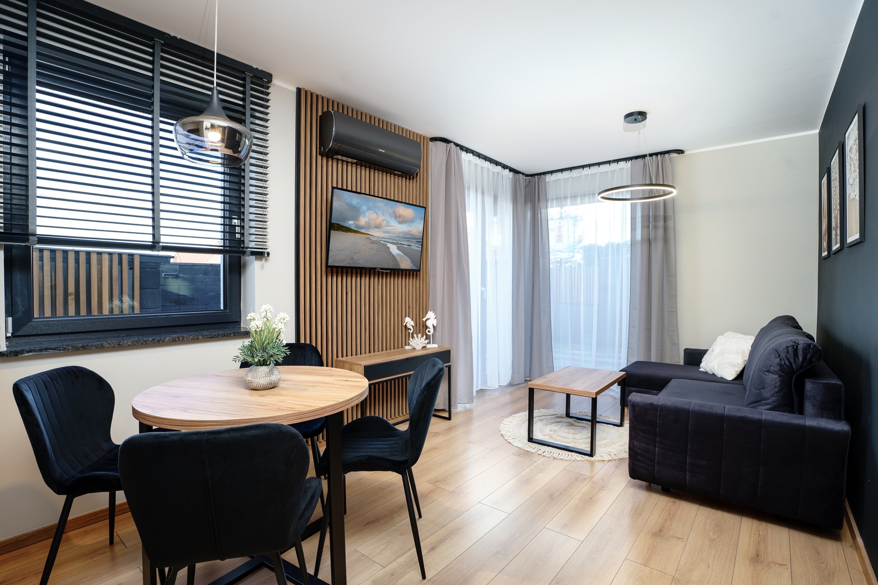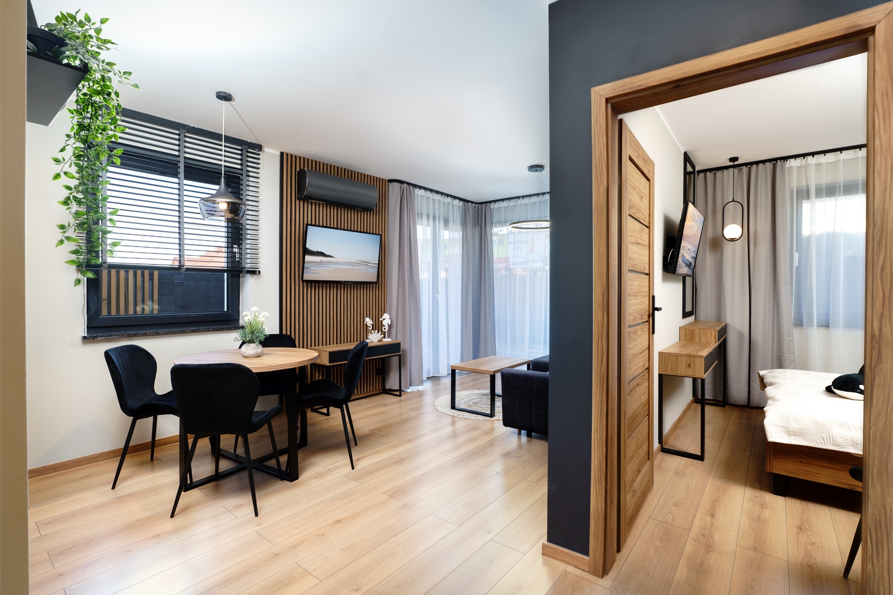 Salon z kuchnią i jadalnią, sypialnia, łazienka. Wyjście na ogród, na którym do dyspozycji jest komplet mebli ogrodowych.