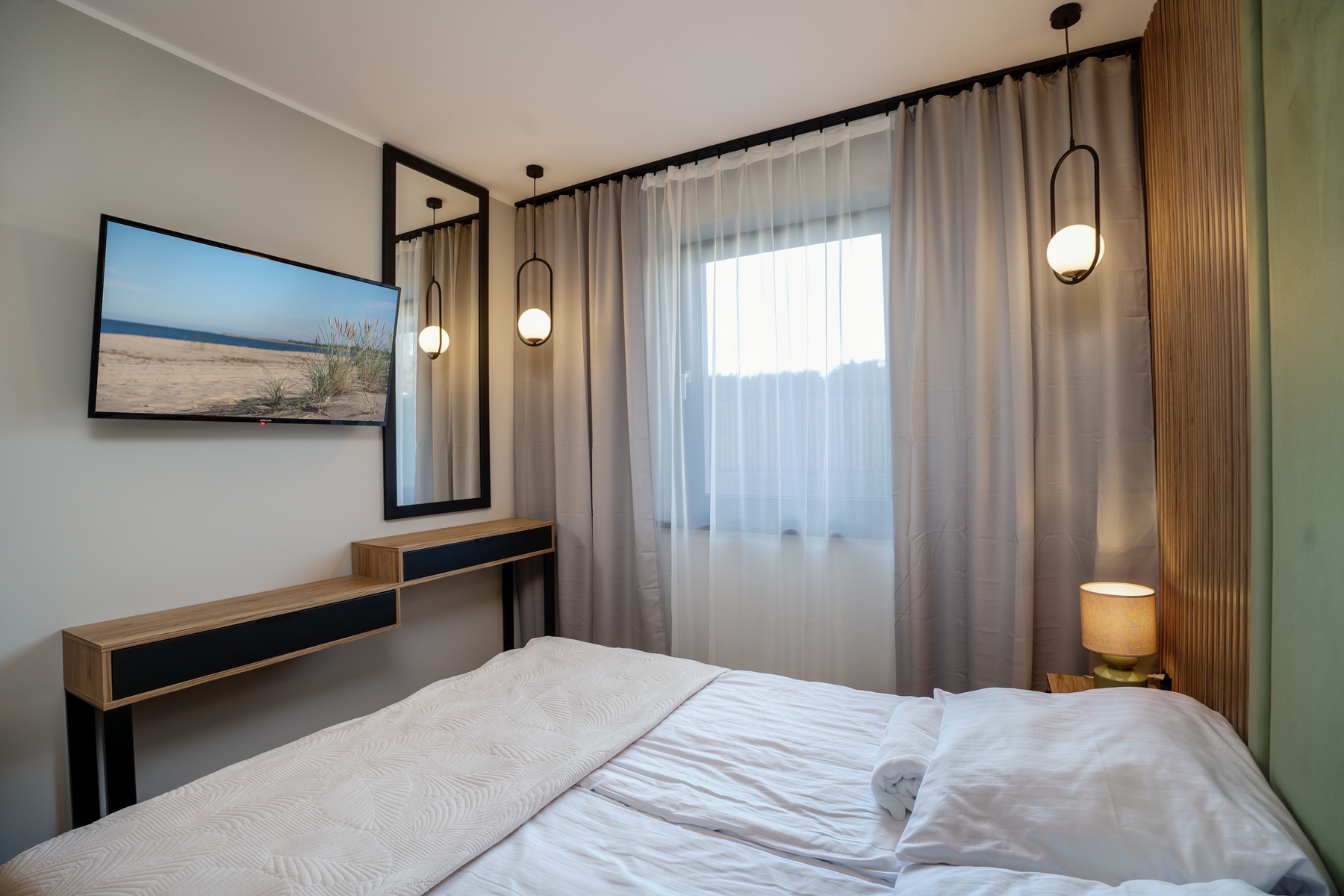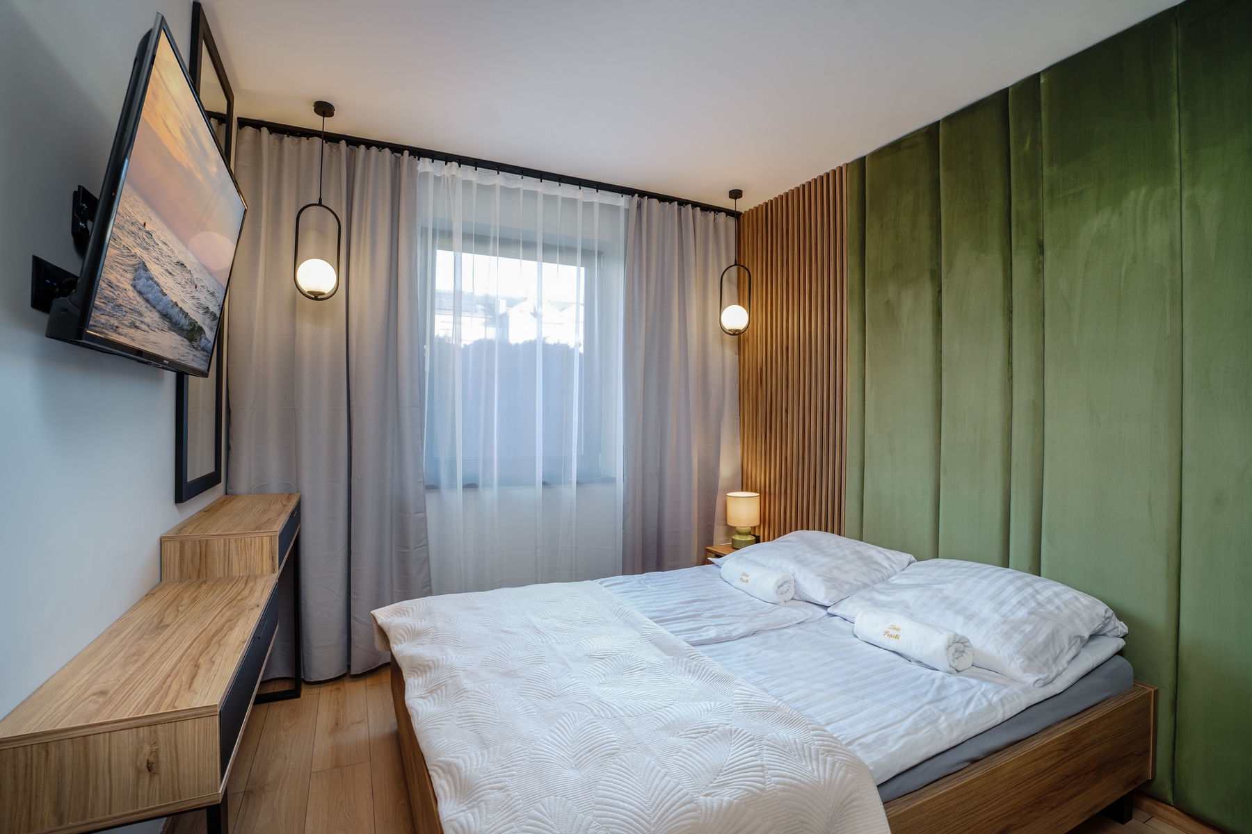 Dwuosobowe łóżko małżeńskie w sypialni + rozkładany dwuosobowy narożnik z funkcją spania w salonie.