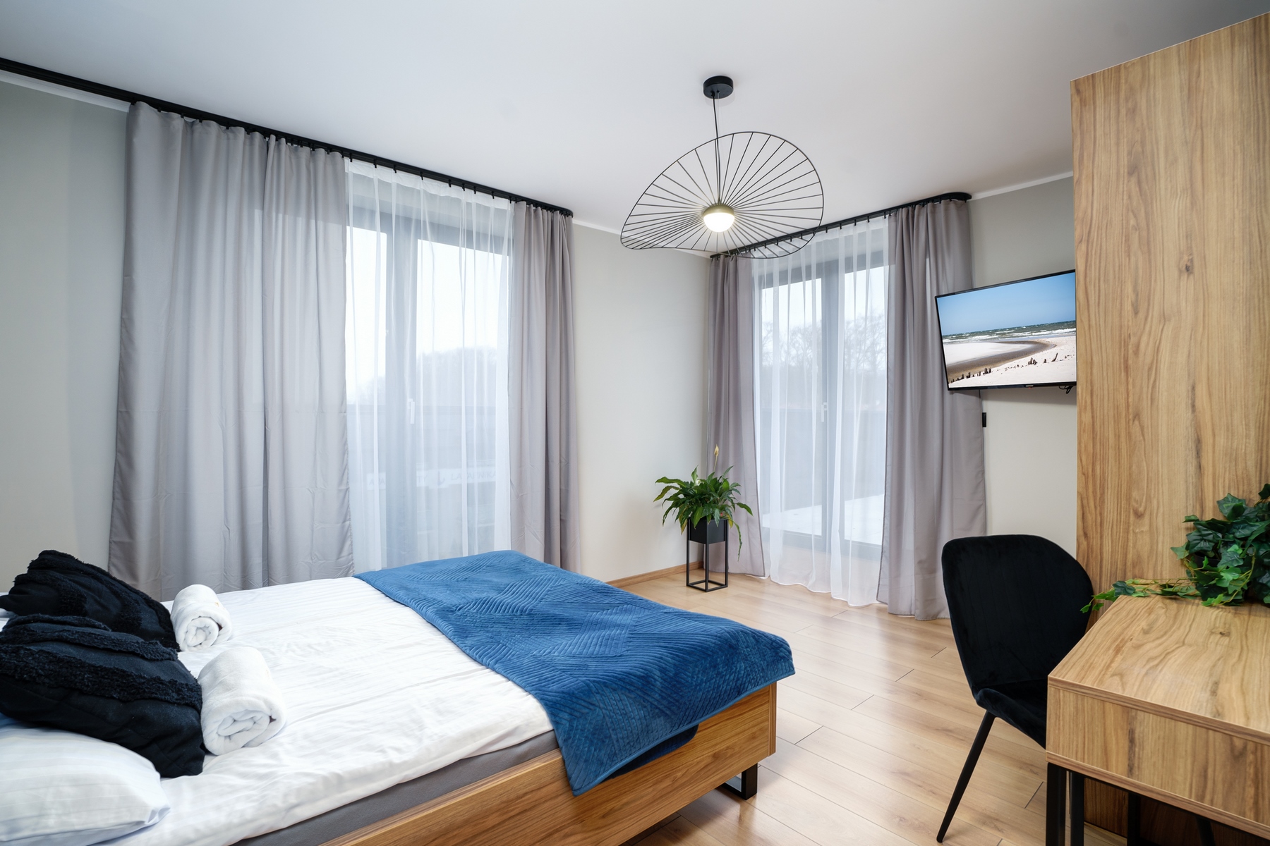 Dwuosobowe łóżko małżeńskie w sypialni + rozkładany dwuosobowy narożnik z funkcją spania w salonie