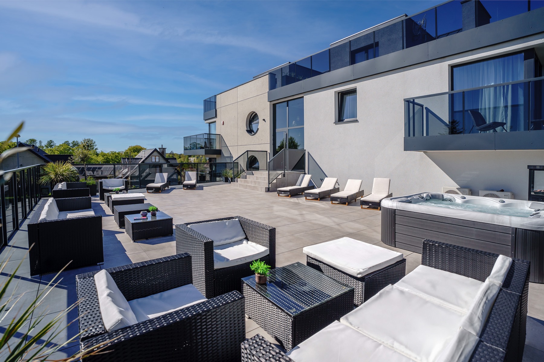 Zapraszamy do relaksu na słonecznym tarasie wypoczynkowym, wyposażonym w eleganckie meble i nowoczesne udogodnienia, takie jak jacuzzi, tworzące idealne miejsce do odpoczynku. Ciesz się spokojem i komfortem w luksusowym otoczeniu, z widokiem na piękną okolicę.